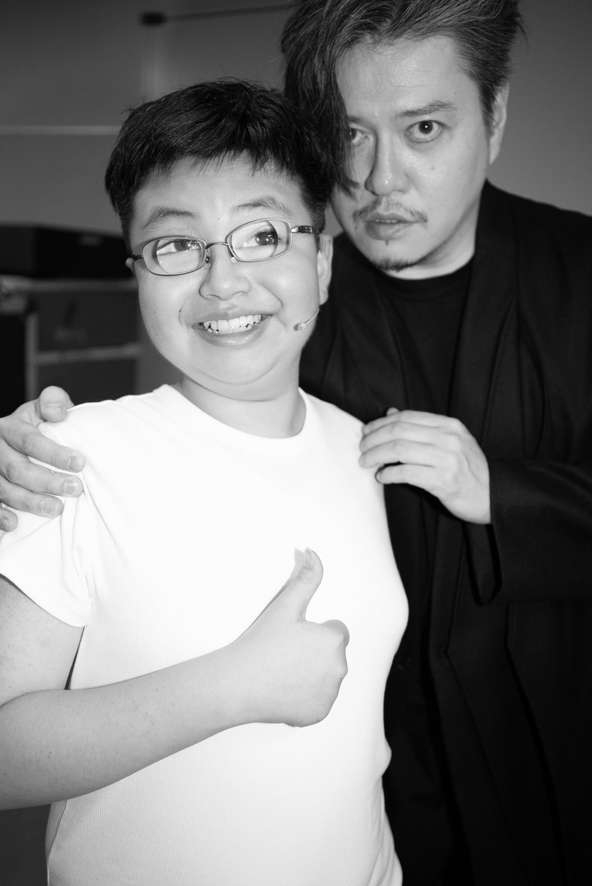 A child performer puts a big grin as he is photographed with composer Keiichiro Shibuya